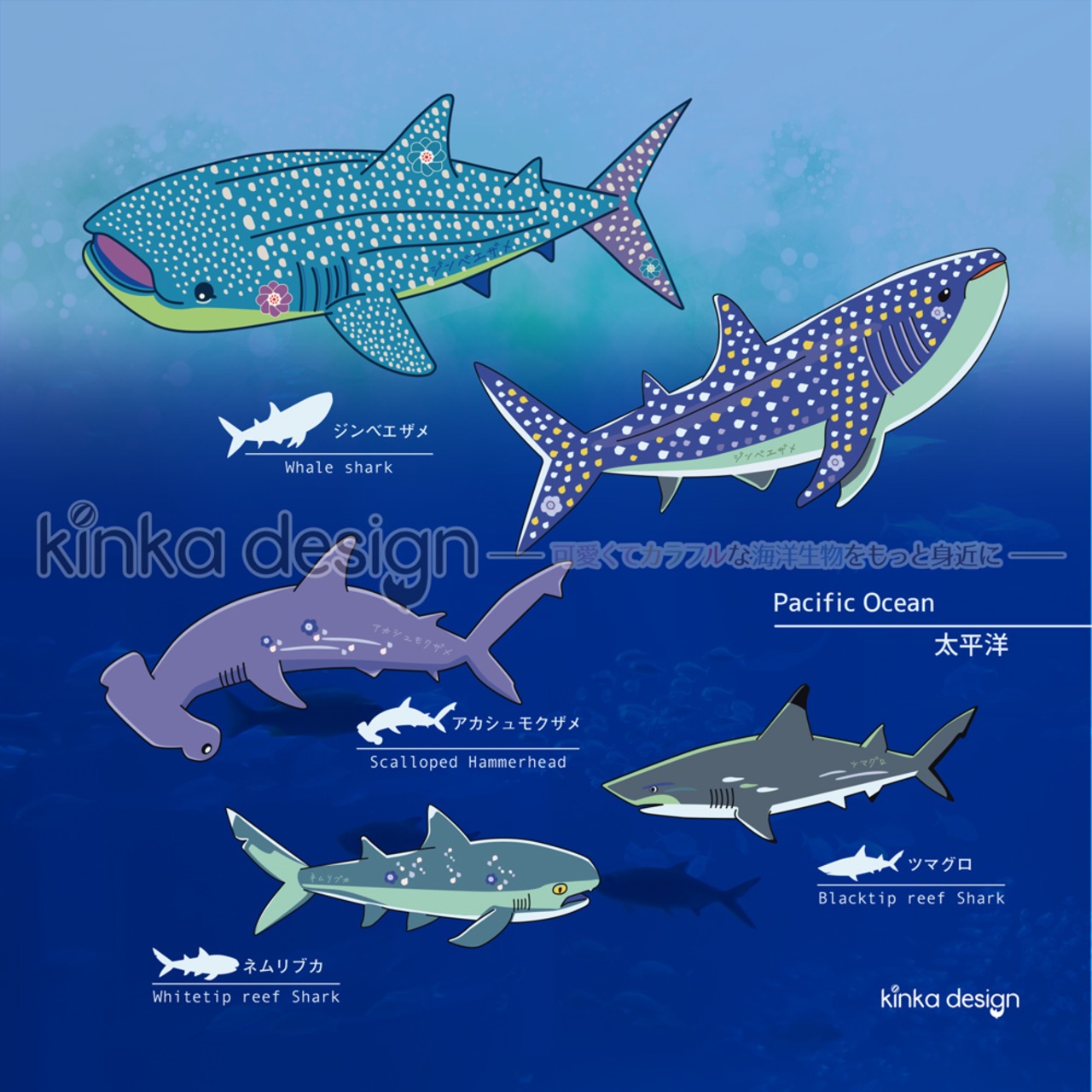 ジンベエザメ、アカシュモクザメ、ツマクロ、ネムリブカ